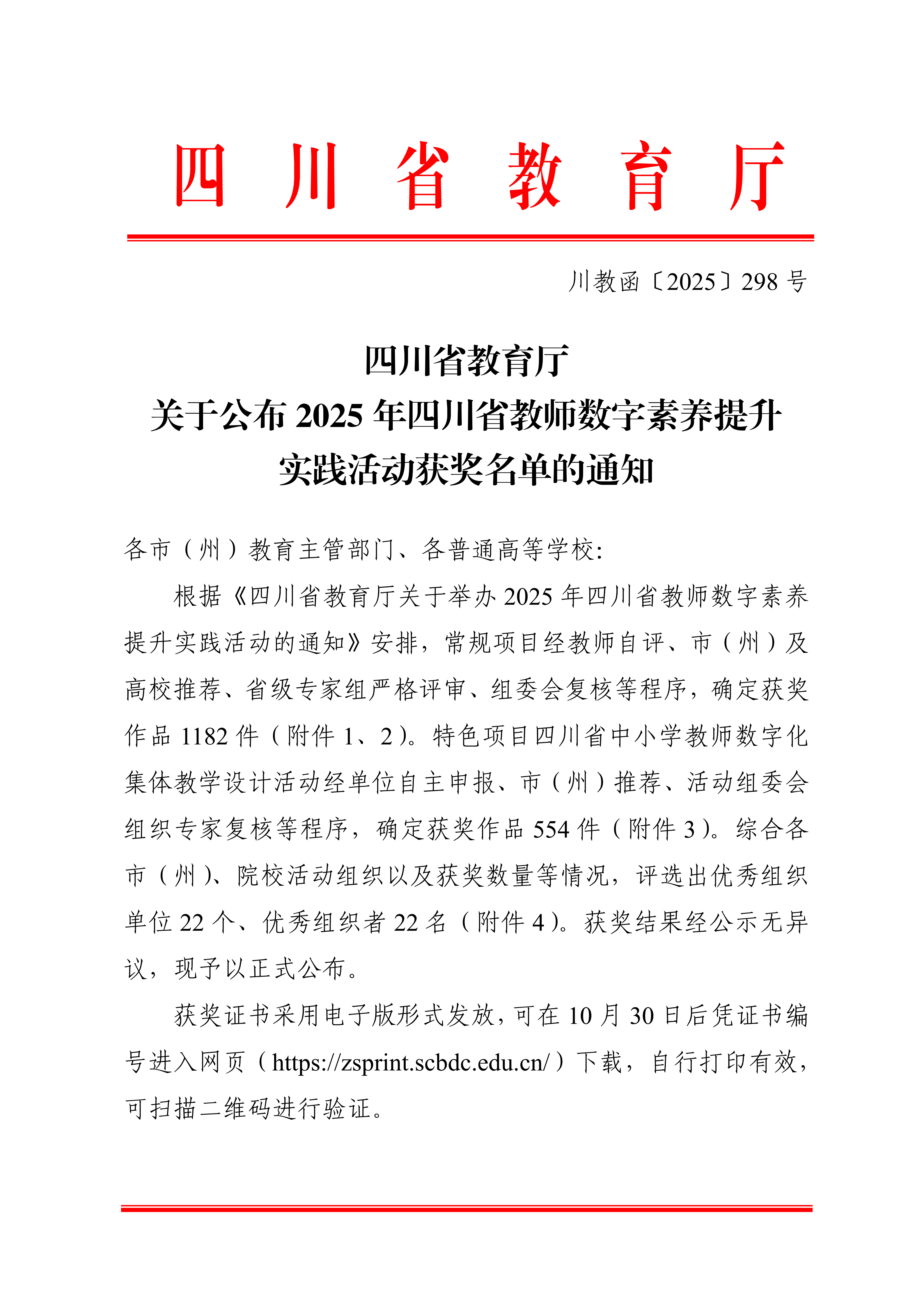 近日,四川省教育厅公布2025年四川省教师数字素养提升实践活动获奖名单。四川电影电视学院教师团队荣获高等教育组二等奖 1 项、三等奖 2 项。