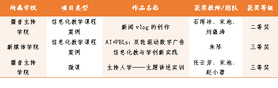 播音主持学院石雨冰老师团队申报的信息化教学课程案例《新闻vlog的创作》,聚焦新媒体传播实践与专业教学的有机结合,构建了兼具实践性与创新性的数字化教学体系,荣获高等教育组二等奖。
